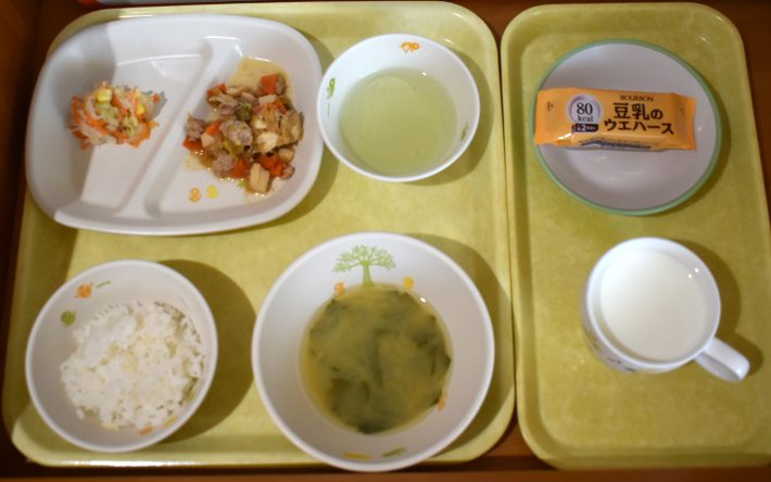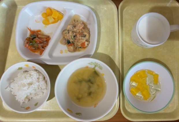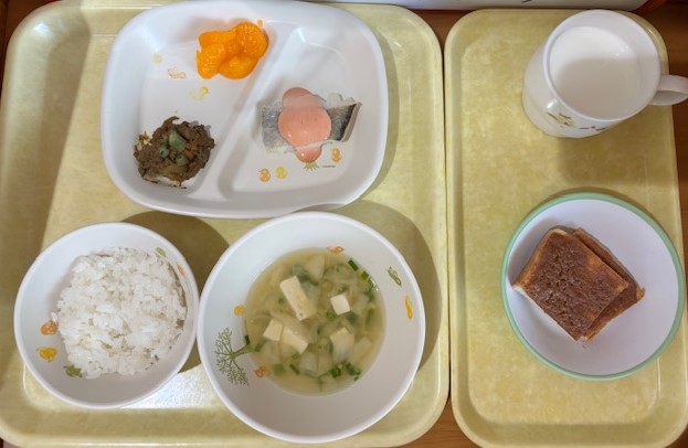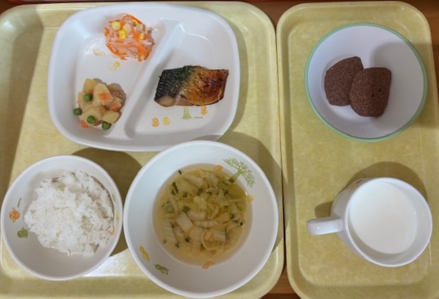 11月10日(月) 2025年11月10日 今日の給食・献立 【本日のメニュー】 【給食】 ごはん 魚のムニエルオーロラソース じゃがぴーレバー炒め みかん缶 みそ汁 【おやつ】 きなこトースト 牛乳 続きを読む 11月8日(土) 2025年11月8日 今日の給食・献立 【本日のメニュー】 【給食】 ごはん 肉豆腐 野菜サラダ ゼリー みそ汁 【おやつ】 豆乳ウエハース 牛乳 続きを読む 11月7日(金) 2025年11月7日 今日の給食・献立 【本日のメニュー】 【給食】 豚丼 春雨サラダ バナナ すまし汁 【おやつ】 アップルケーキ 牛乳 続きを読む 11月6日(木) 2025年11月6日 今日の給食・献立 【本日のメニュー】 【給食】 ごはん 厚揚げ豆腐と鶏肉の卵とじ きのことこんにゃくのきんぴら 黄桃缶 みそ汁 【おやつ】 二色ゼリー 牛乳 続きを読む 11月5日(水) 2025年11月5日 今日の給食・献立 【本日のメニュー】 【給食】 ごはん 魚のあおさ焼 じゃが芋のそぼろ煮 大根の酢の物 すまし汁 【おやつ】 ココアクッキー 牛乳 続きを読む 12345
