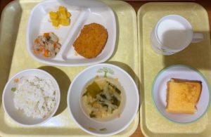 6月9日(月) 2025年06月9日 今日の給食・献立 【本日のメニュー】 【給食】 ごはん コロッケ 鶏肉と野菜の味噌炒め 黄桃缶 すまし汁 【おやつ】 フレンチトースト 牛乳 古い記事へ 一覧へ 新しい記事へ