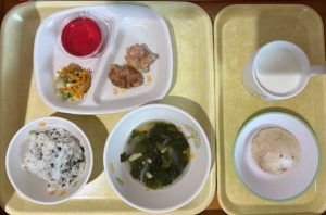 7月15日(火) 2025年07月15日 今日の給食・献立 【本日のメニュー】 【給食】 わかめごはん 鶏肉の唐揚げ ブロッコリーサラダ ぶどうゼリー すまし汁 【おやつ】 ジャム蒸しパン 牛乳 古い記事へ 一覧へ 新しい記事へ