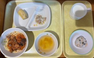 7月29日(火) 2025年07月29日 今日の給食・献立 【本日のメニュー】 【給食】 鶏肉と茄子のスパゲティ ウィンナーとキャベツのソテー バナナ コンソメスープ 【おやつ】 さけわかめおにぎり 牛乳 古い記事へ 一覧へ 新しい記事へ