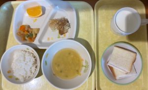 8月26日(火) 2025年08月26日 今日の給食・献立 【本日のメニュー】 【給食】 ごはん 魚のごまサクサク焼き 丸天とじゃが芋の旨煮 オレンジ みそ汁 【おやつ】 いちごジャムサンドイッチ 牛乳 古い記事へ 一覧へ 新しい記事へ