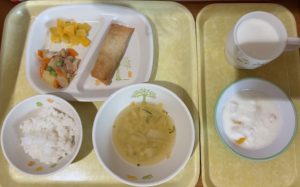 9月22日(月) 2025年09月22日 今日の給食・献立 【本日のメニュー】 【給食】 ごはん 春巻 豚肉とじゃが芋の甘辛炒め 黄桃缶 みそ汁 【おやつ】 フルーツヨーグルト 牛乳 古い記事へ 一覧へ 新しい記事へ